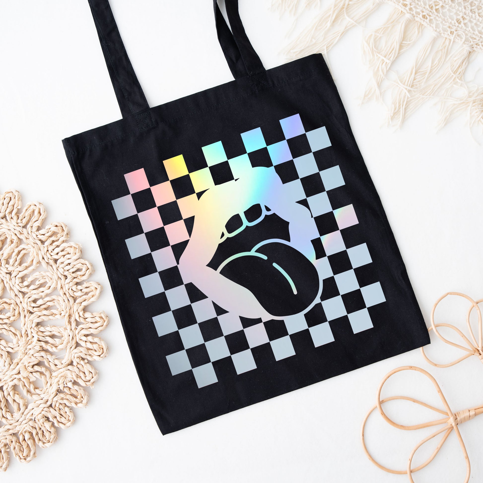 The holographic design adds a playful twist to the classic tote bag, offering a unique and eye-catching accessory that's both fashionable and functional. Whether you're a fan of retro aesthetics or just appreciate an attention-grabbing design, our holographic tote bag is destined to become your new favorite fashion statement!