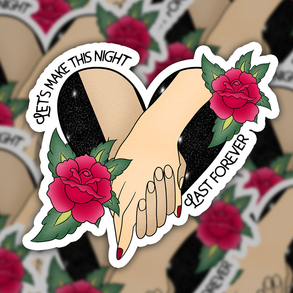 Inspired by Blink 182's iconic song 'First Date', this sticker captures the timeless essence of connection and romance. Featuring two intertwined hands and two roses drawn in a traditional tattoo style, this sticker exudes a sense of timeless love and devotion for pop-punk lovers.