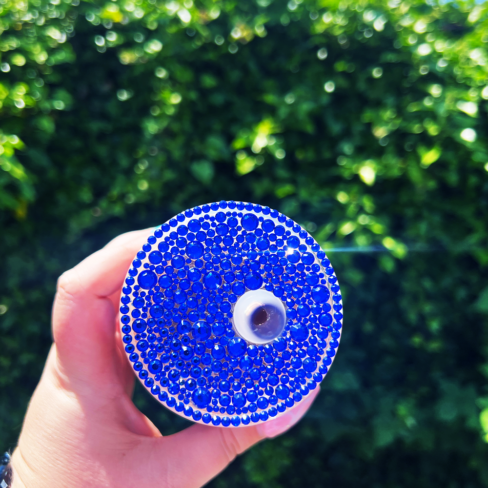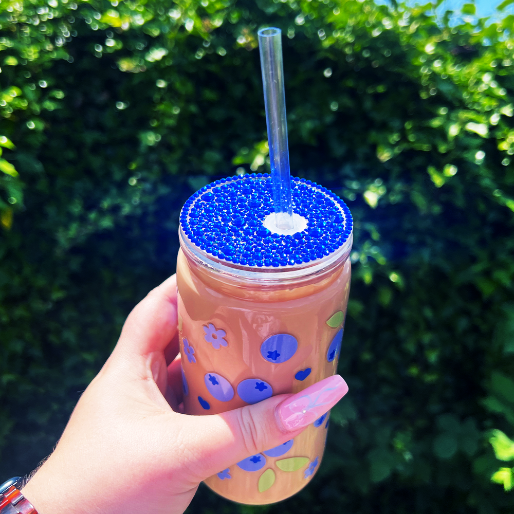 Adding a stunning finishing touch, the blue lid and straw are individually hand-decorated with sparkling rhinestones. The crystals catch the light beautifully, giving the tumbler a glamorous, eye-catching shine. Each lid is crafted by hand, meaning every piece is slightly unique — a true one-of-a-kind accessory for lovers of sparkle.