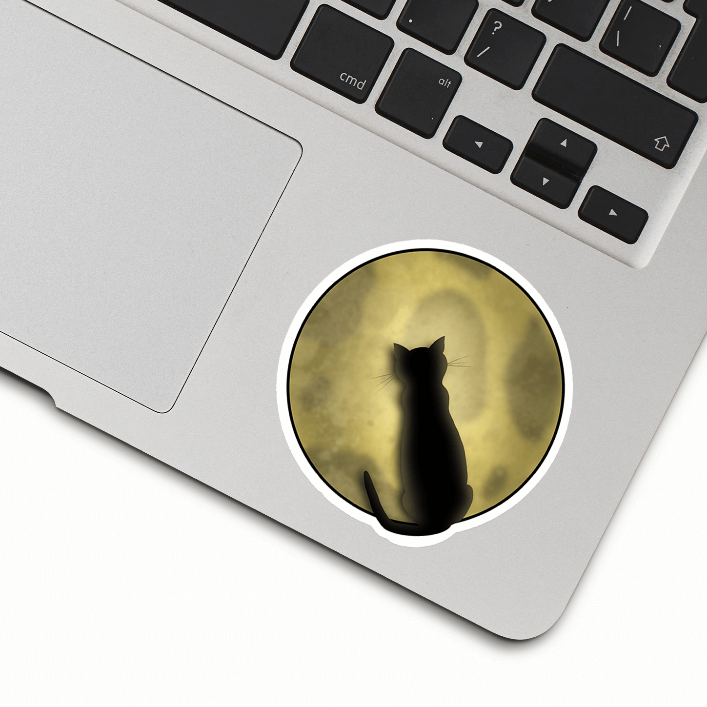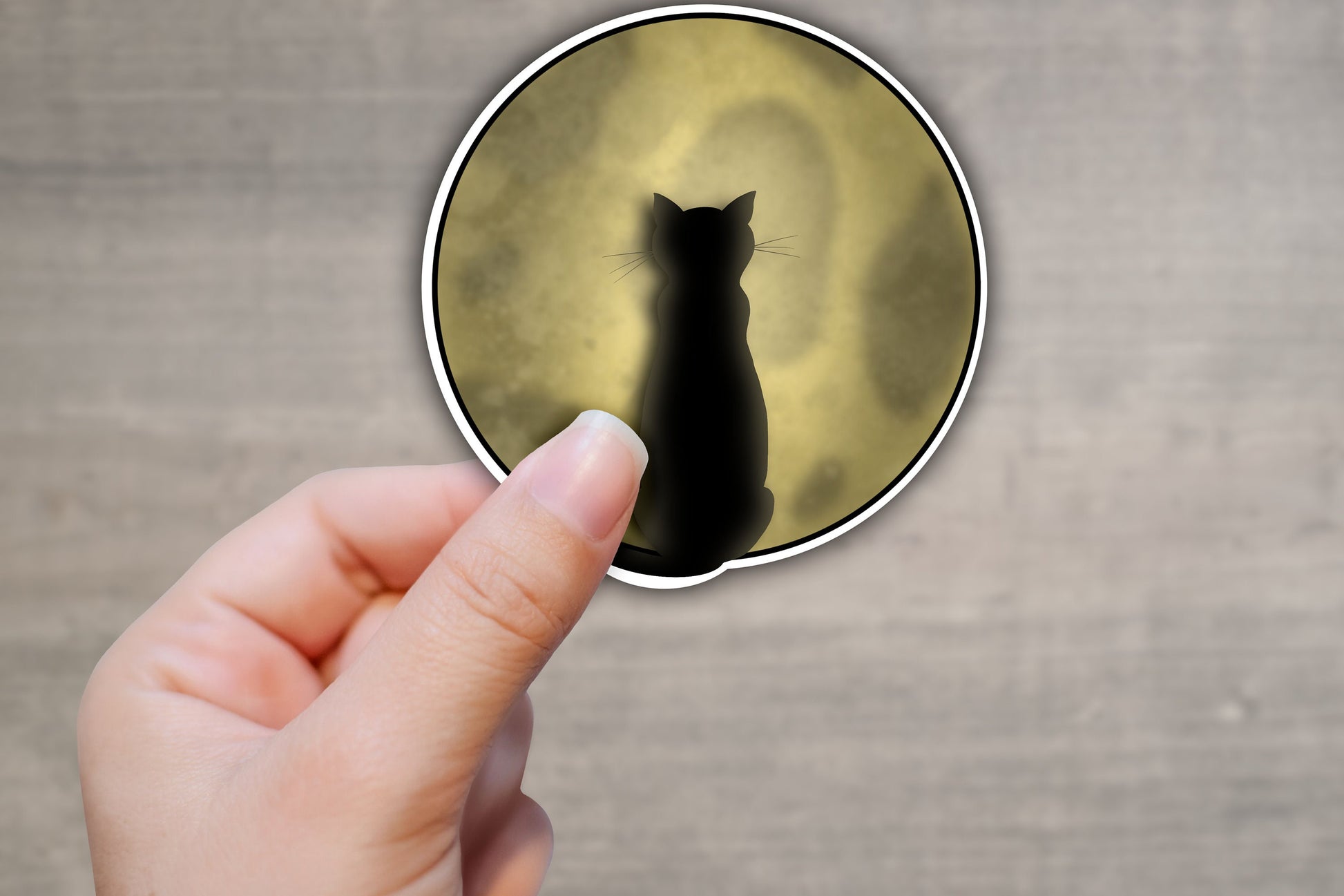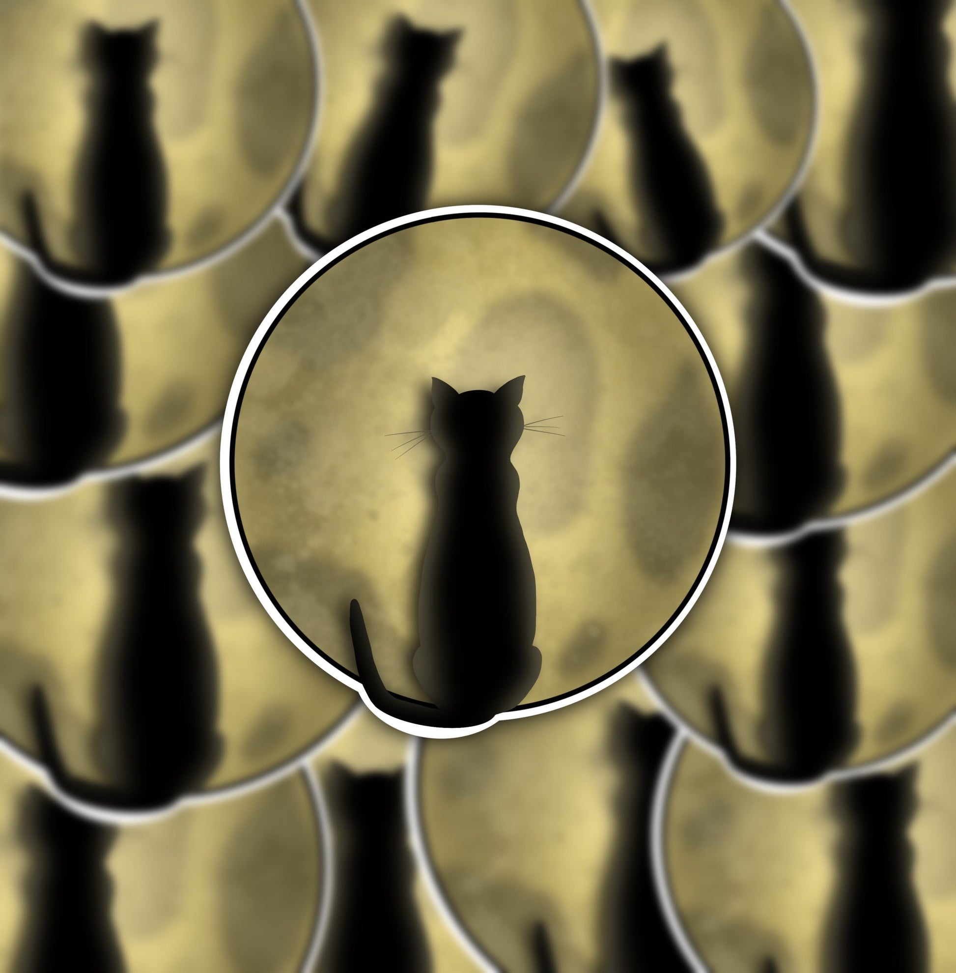 Introducing our enchanting moonlit feline vinyl sticker, a captivating addition to any surface. Against the backdrop of a luminous full moon, a graceful silhouette of a cat stands, poised in quiet majesty, casting an aura of mystery and charm.