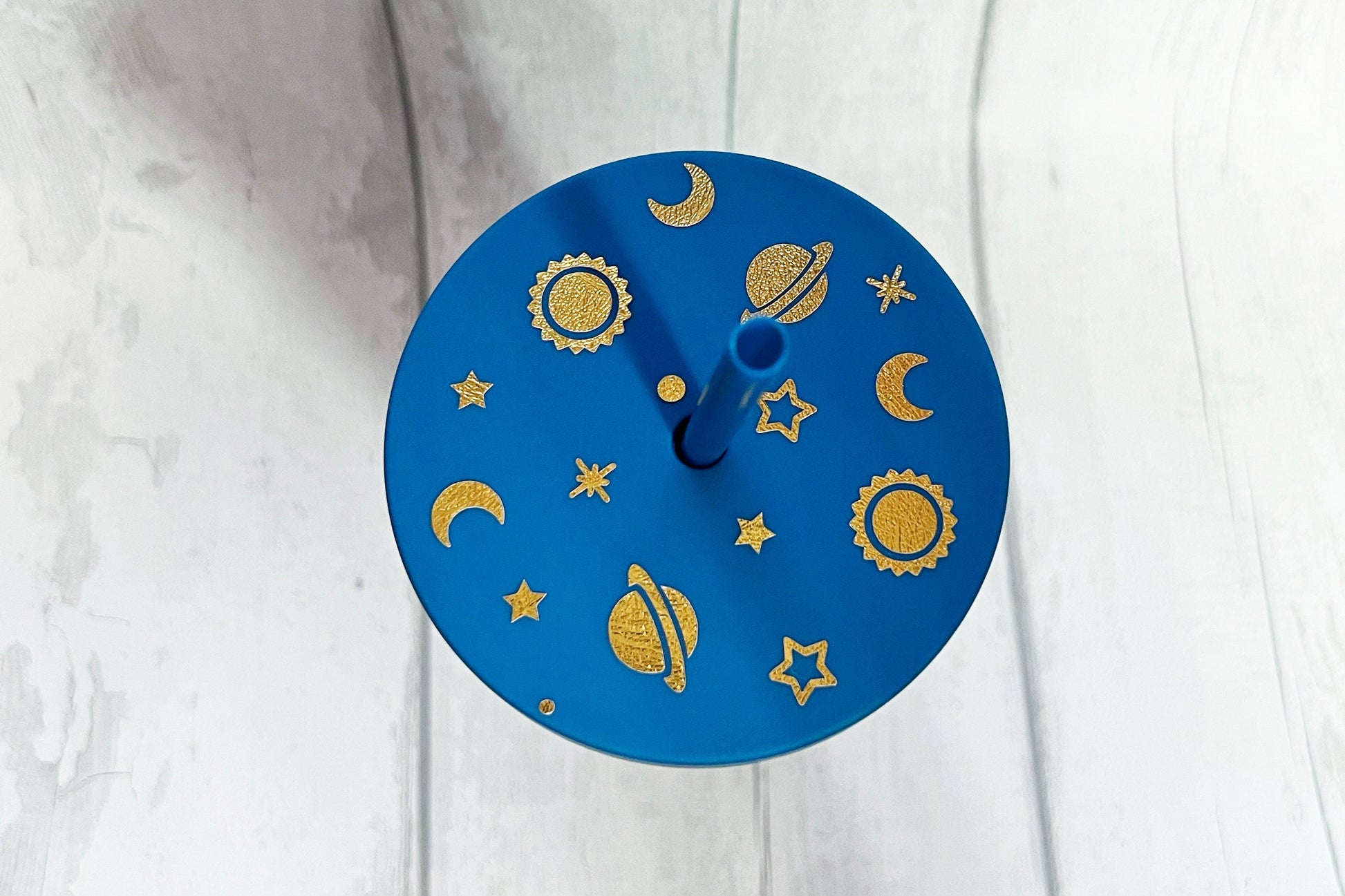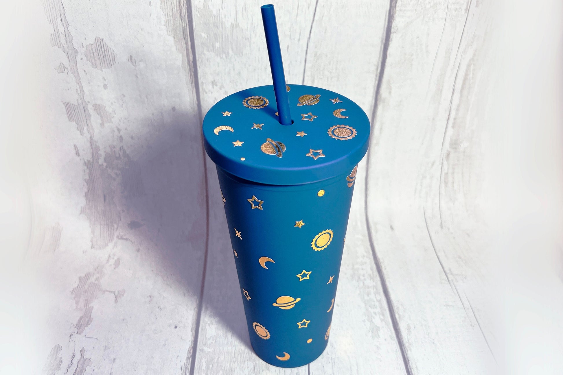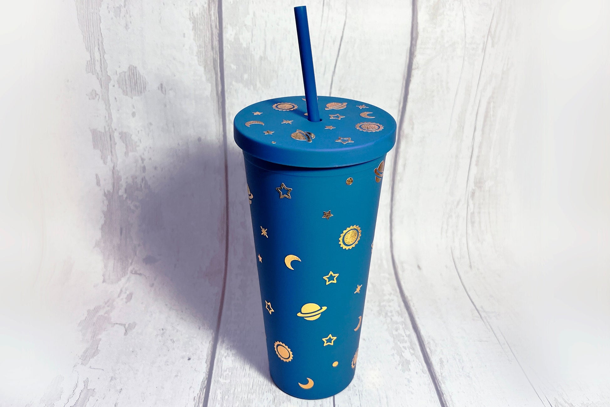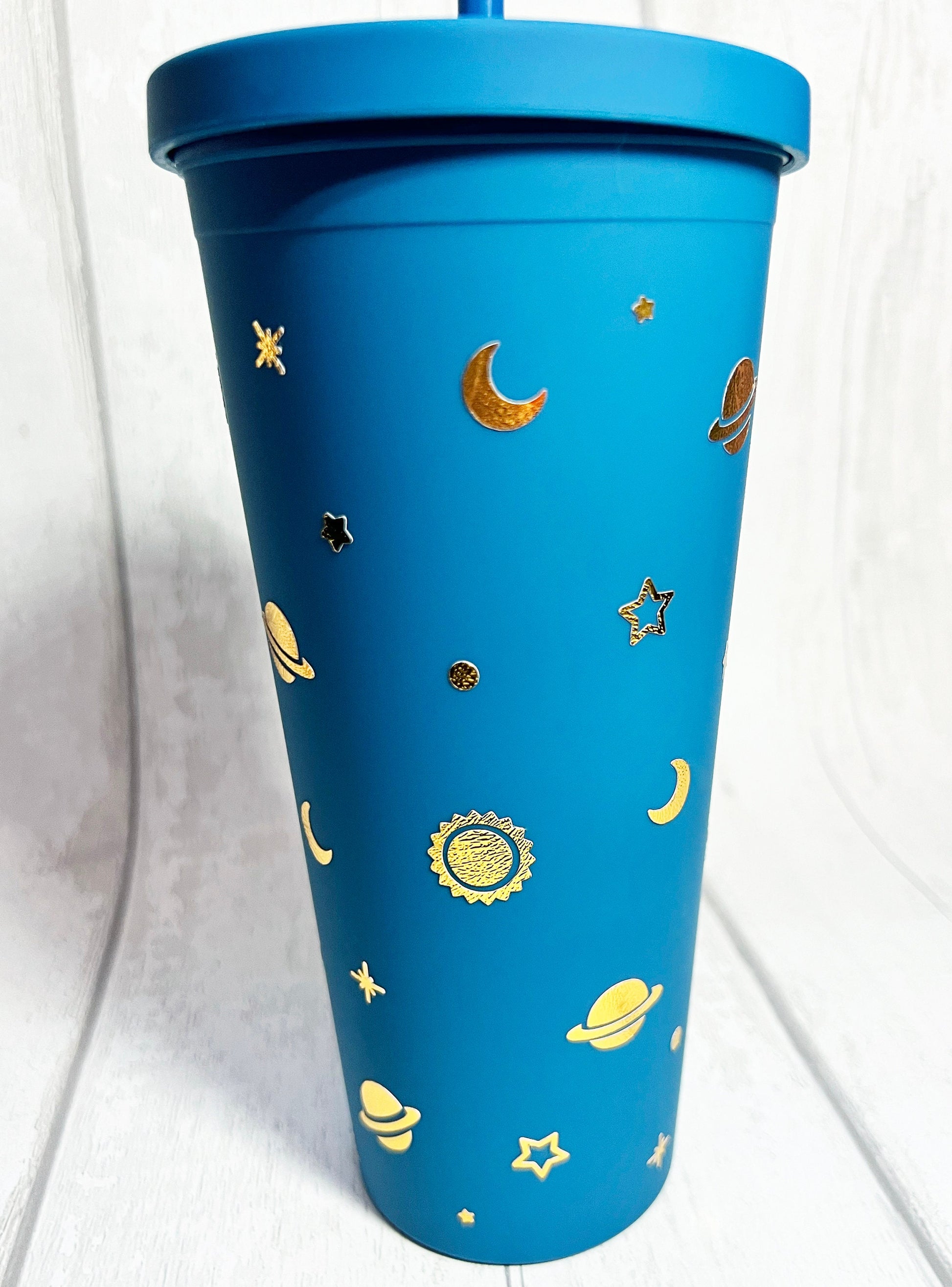 Introducing our breathtaking blue and gold celestial inspired 24oz Starbucks style double-walled cold cup, perfect for those who want to add a touch of cosmic beauty to their daily coffee routine! Featuring an intricate design of stars, suns, moons, and planets, this cup is truly out of this world.