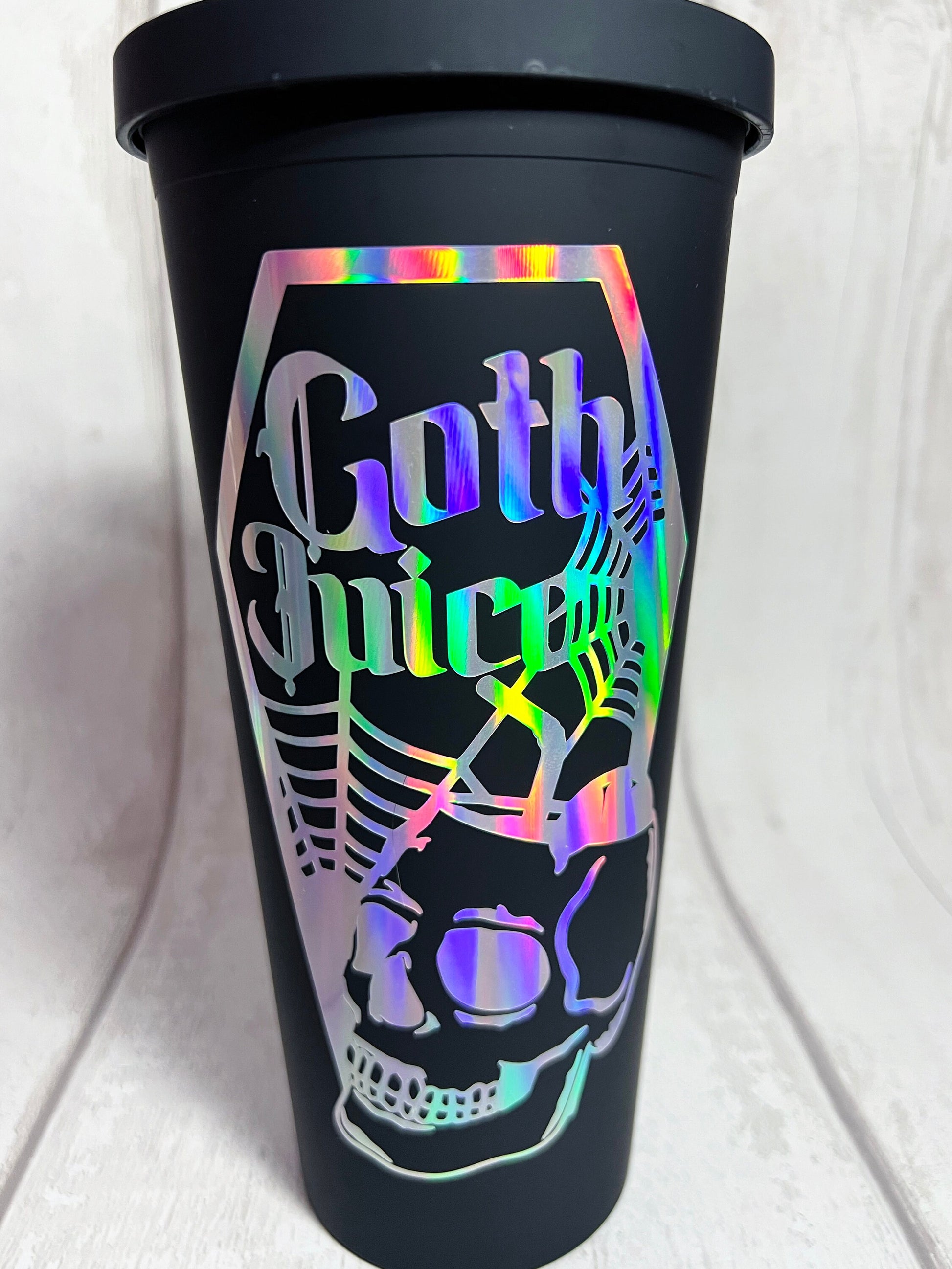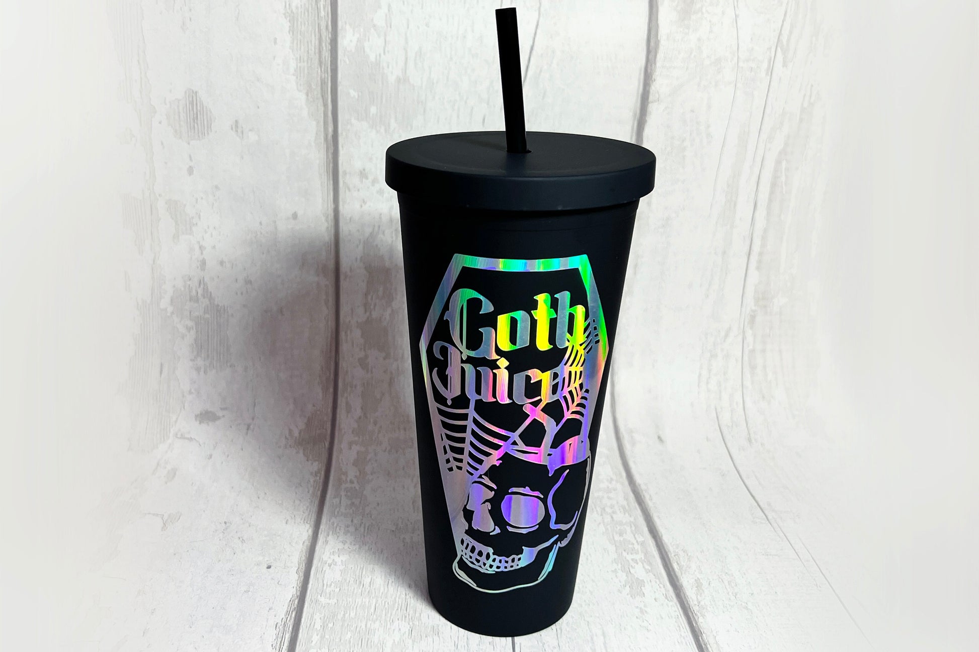 Whether you're a goth at heart or just love a bit of edgy style, this holographic skull 'goth juice' design on a black cold cup is sure to turn heads. Order yours today and add some dark flair to your daily coffee routine!