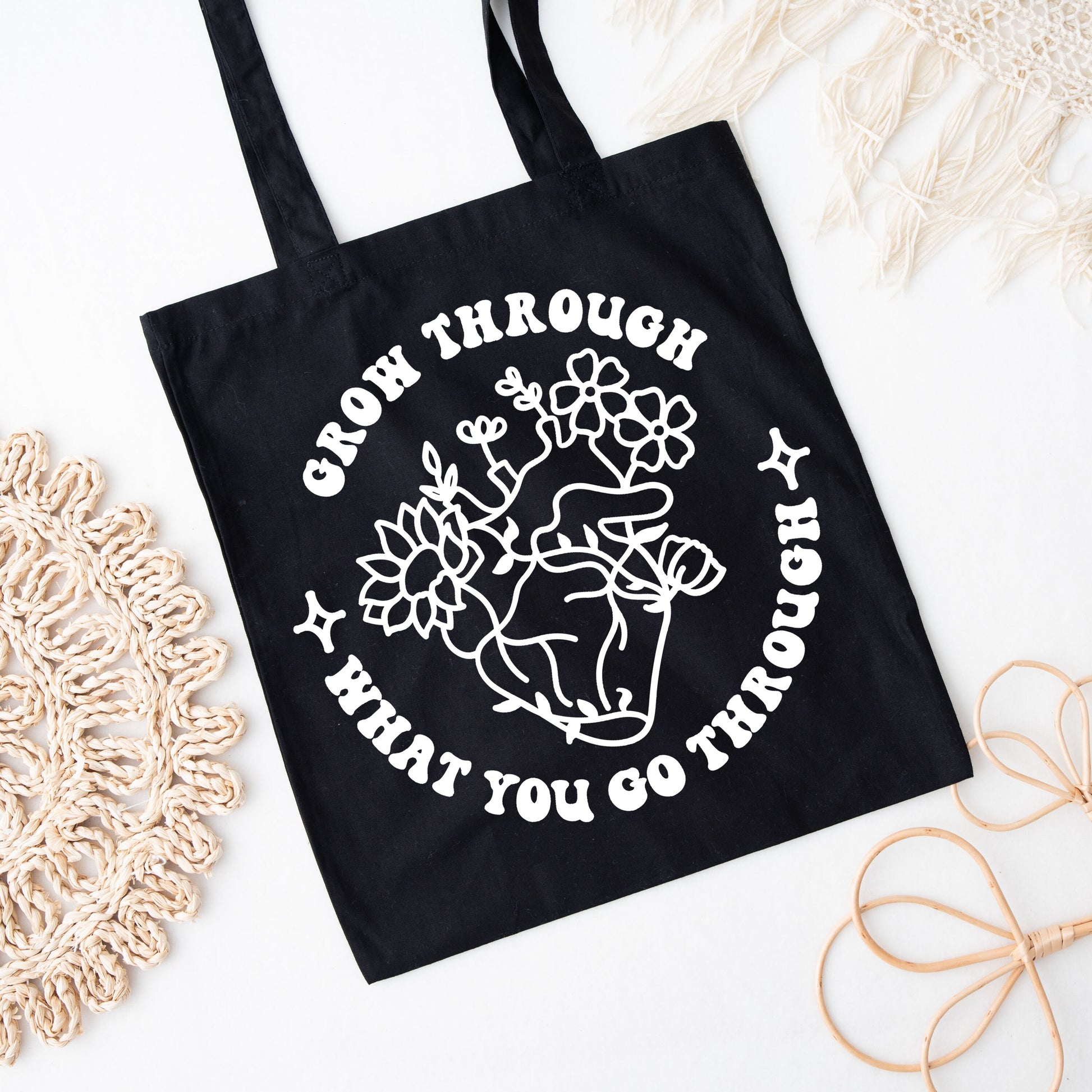 Elevate your style while carrying a message of strength and perseverance with our Black Tote Bag. It's the perfect accessory to inspire and remind you to keep growing through life's ups and downs. Order yours now and wear your resilience proudly.