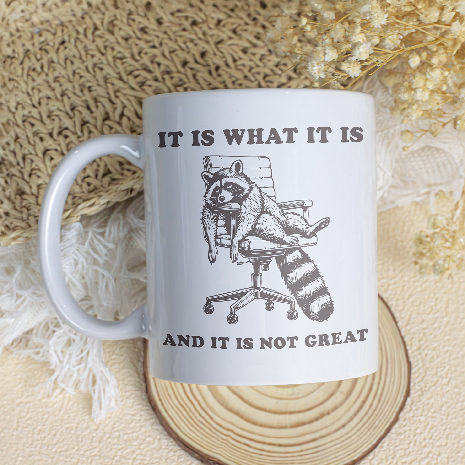 Indulge in the mantra of acceptance with our "It Is What It Is" mug. Sip your favourite beverage in this 11oz ceramic mug featuring a whimsical raccoon design. Embrace the simplicity and find peace in the present, one sip at a time.