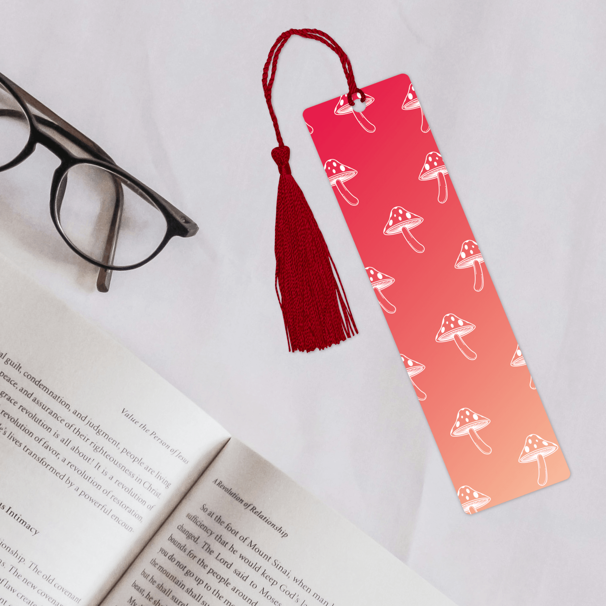 Crafted from high-quality metal, this bookmark is durable and sturdy, ensuring it will last for many reads to come. The unique design of white mushrooms on the bold red ombre background creates a beautiful and eye-catching contrast, making it an ideal gift for nature enthusiasts and those who appreciate unique designs.