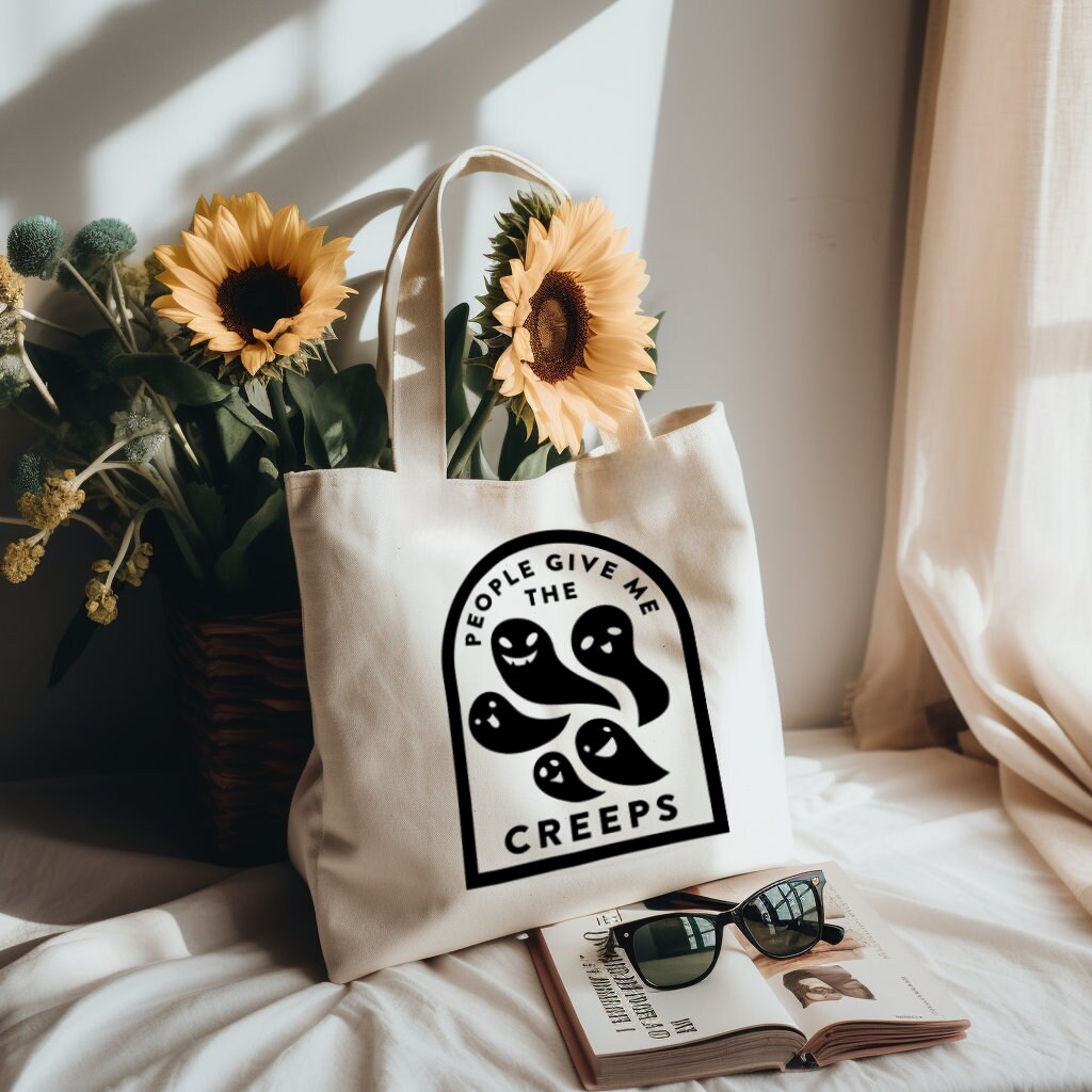 Unleash your inner ghostly wit with our Natural Cotton Tote Bag, donning a striking black design featuring charming ghosts and the humorous phrase, "People give me the creeps." This tote is the ideal blend of spooky style and cheeky humor, making it a unique accessory for those who appreciate a touch of the supernatural in their daily lives.