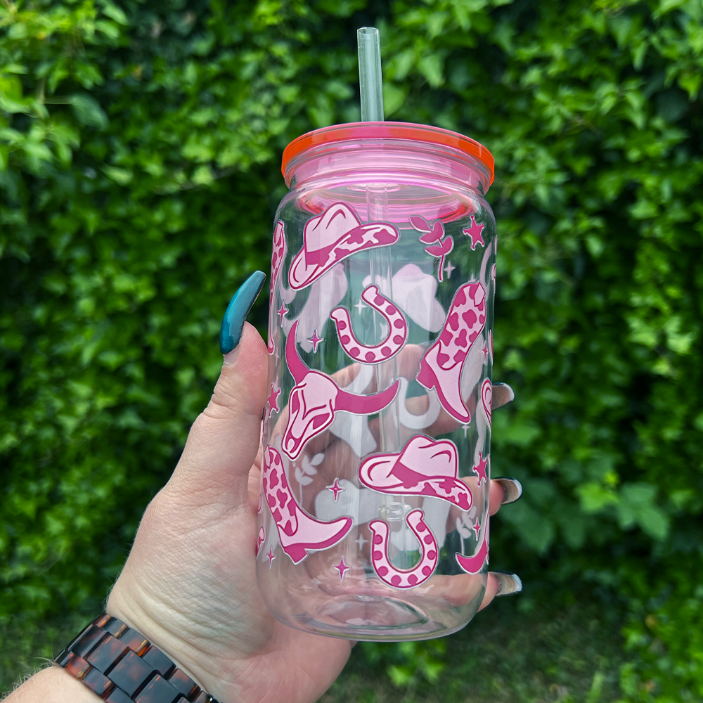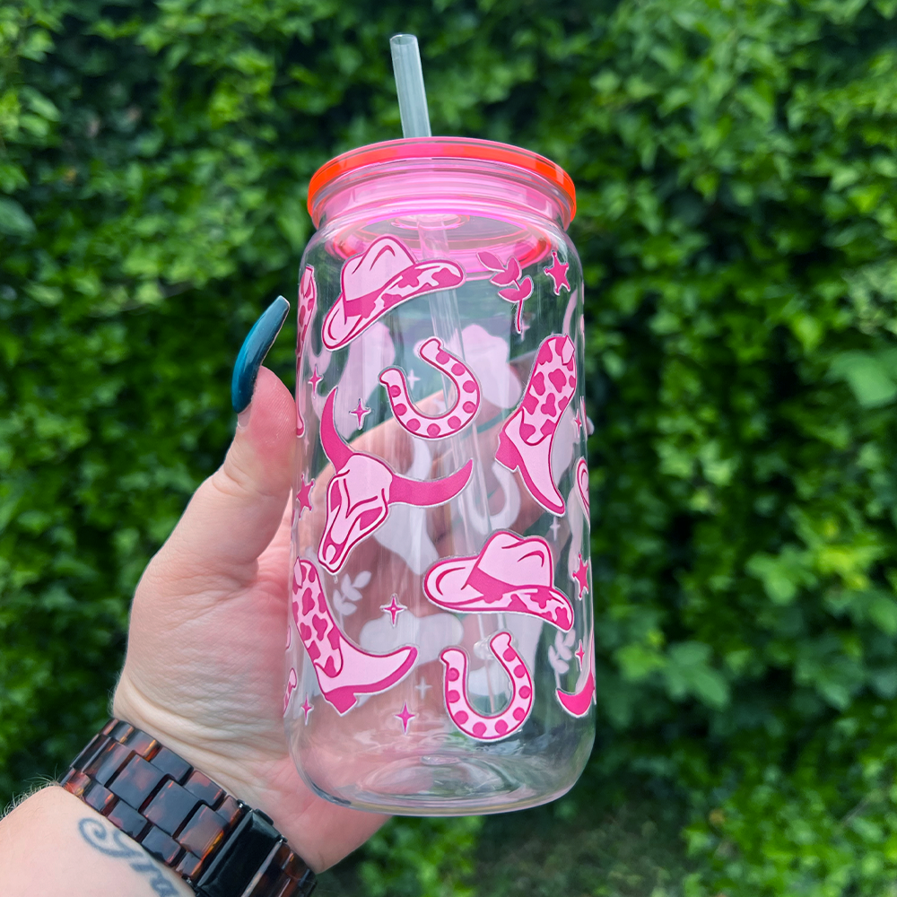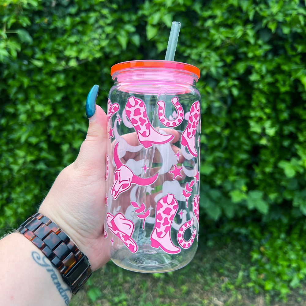Yeehaw, but make it cute! Our 16oz Can Glass with a pink lid and bold pink cowboy design is the perfect way to add a little western flair to your everyday sip. Whether you’re a country girl at heart or just love a playful pop of pink, this tumbler is here to bring the rodeo vibes to your iced coffee routine.