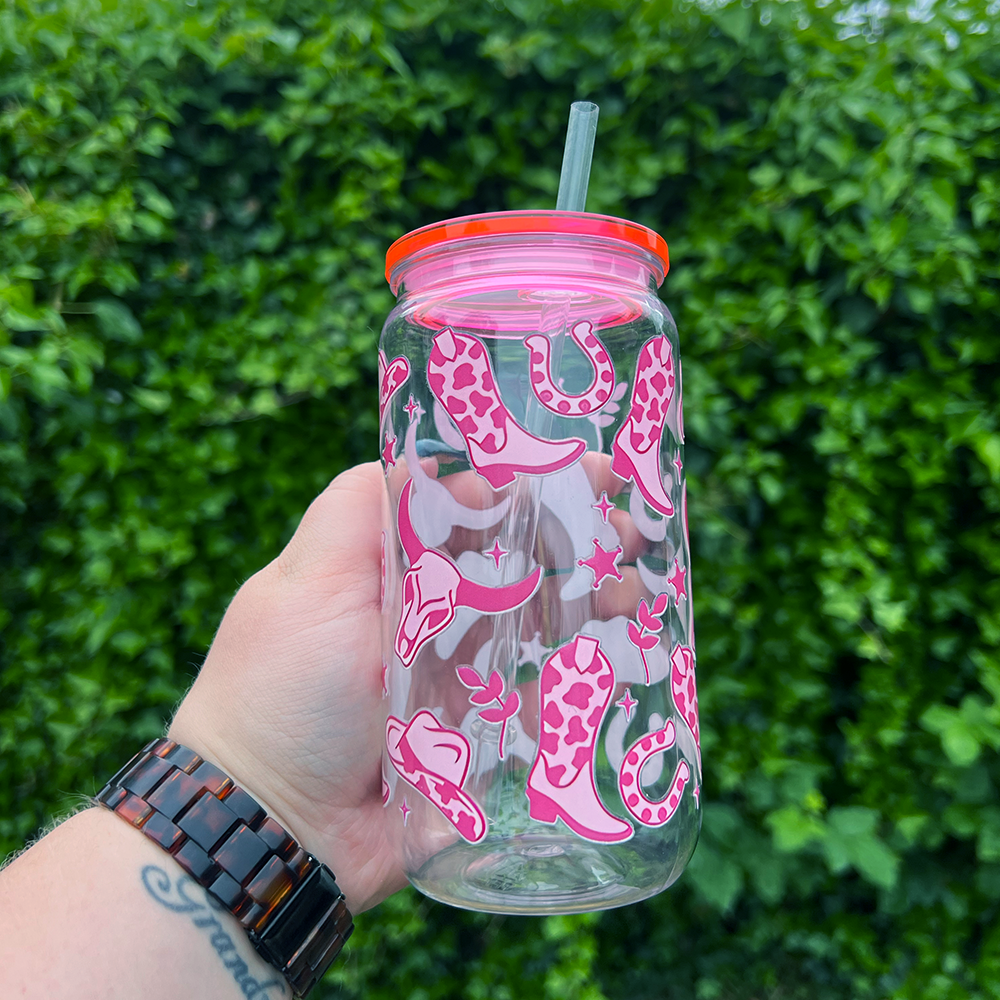 16oz Can Glass – Pink Cowboy Design with Pink Lid