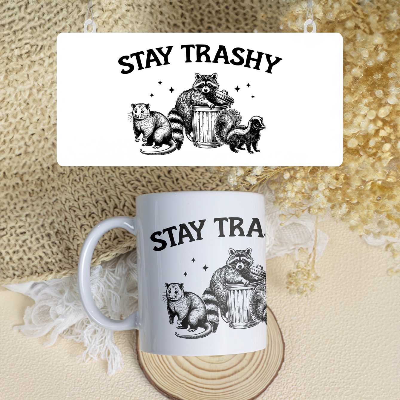 Take a sip and stay trashy with this 11oz Stay Trashy Mug featuring a playful raccoon design. Let this mug be a reminder to embrace your unique and fun-loving nature. Perfect for indulging in your favourite beverage while adding a touch of character to your morning routine.