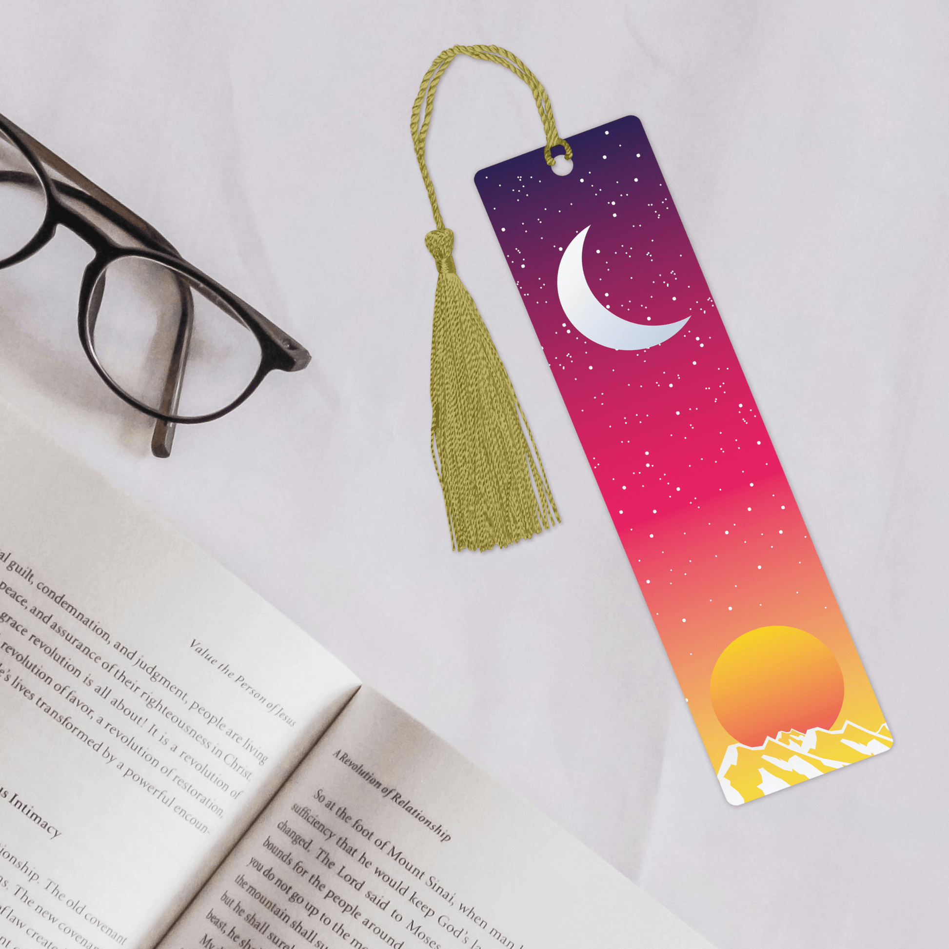 The design features a beautiful moon and sunset over mountains, which adds a touch of serenity and calmness to your reading experience. The bookmark is single-sided and made of metal, ensuring durability and long-lasting use. Plus, the gold silk tassel adds a touch of elegance that will make you feel like royalty while reading. Don't miss out on this unique and charming bookmark!
