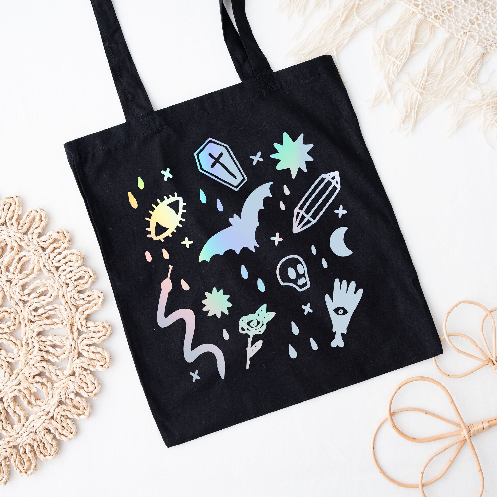 Step into the world of mysticism and minimalism with our captivating Black Tote Bag, adorned with a holographic minimalist witch design. This enchanting design features a sleek amalgamation of a serpent, a coffin, a skull, glistening crystals, and a delicate rose, encapsulating the essence of the occult with a modern twist.