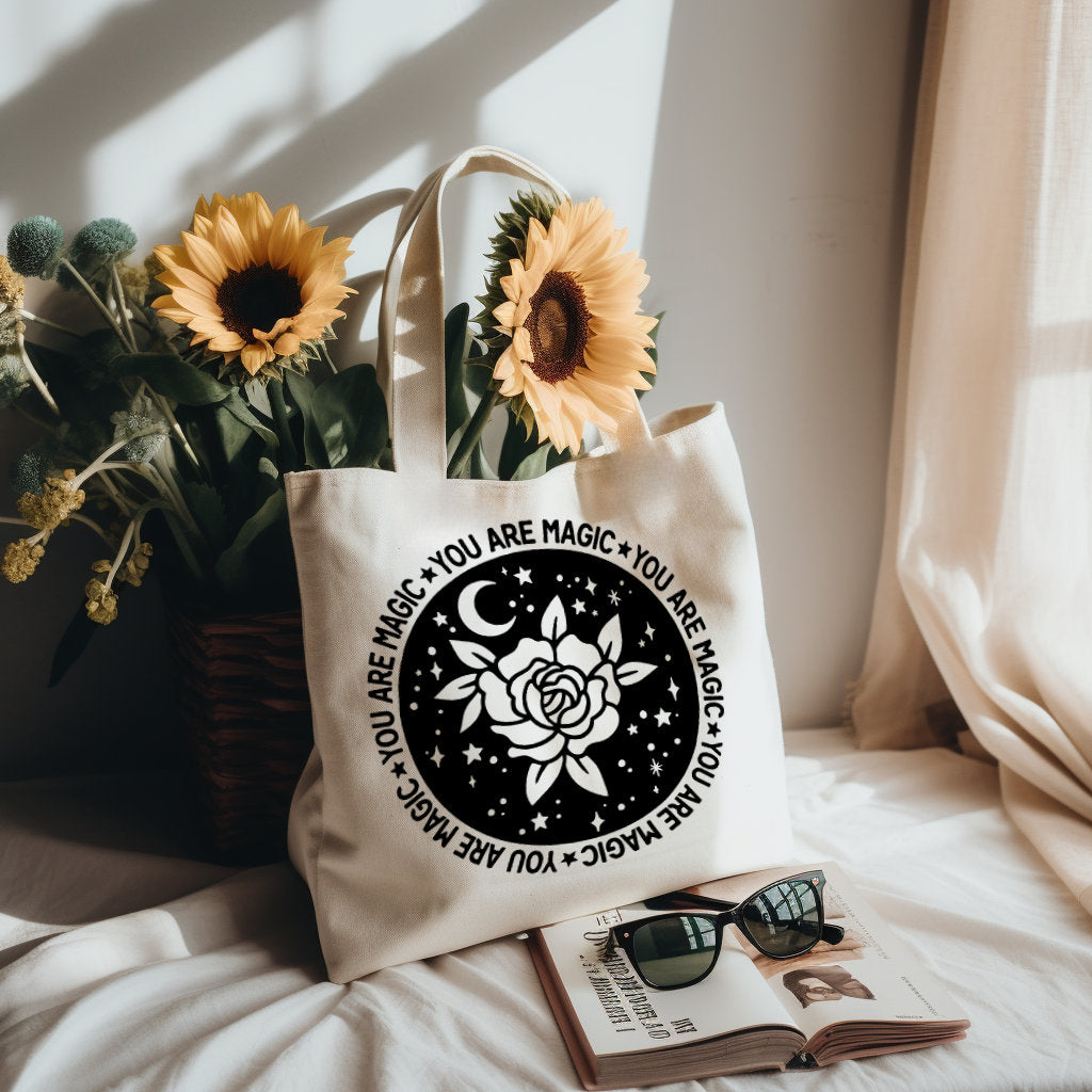 The "You Are Magic" design is a beautiful reminder that you are capable of amazing things. Whether you're a fan of all things celestial or just love a unique and inspiring design, our tote bag is sure to become your go-to accessory!